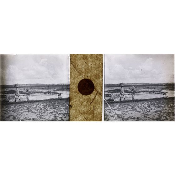 D68-31. Le riz est la nourriture de base à Madagascar. Les terrains favorables étant assez rares, les Malgaches ont recours aux cultures en terrasses. Vers novembre, les hommes labourent la terre à l'aide de leur longue bêche, l'engady. Après la saison des pluies, les femmes viennent repiquer une à une les pousses dans les rizières inondées. La récolte puis le battage des gerbes ont lieu en mars.