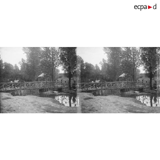 Ville-sur-Cousances (Meuse). Pont rustique et chevaux dans la Cousances .