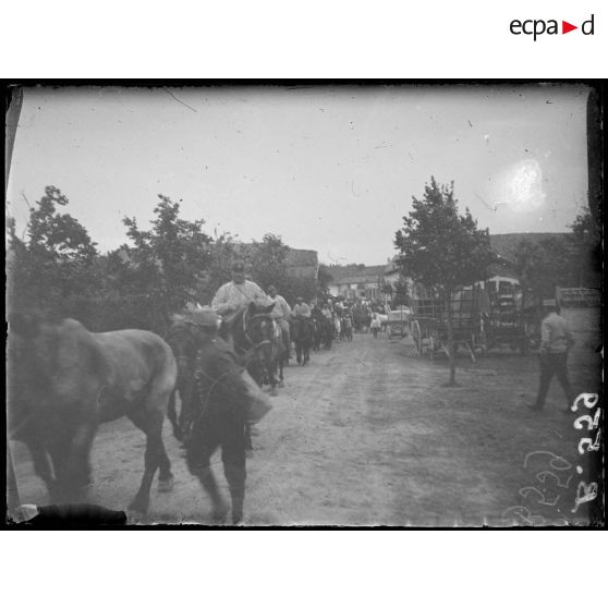 Souilly (Meuse). Soldats du Train conduisant leurs chevaux à l’abreuvoir.