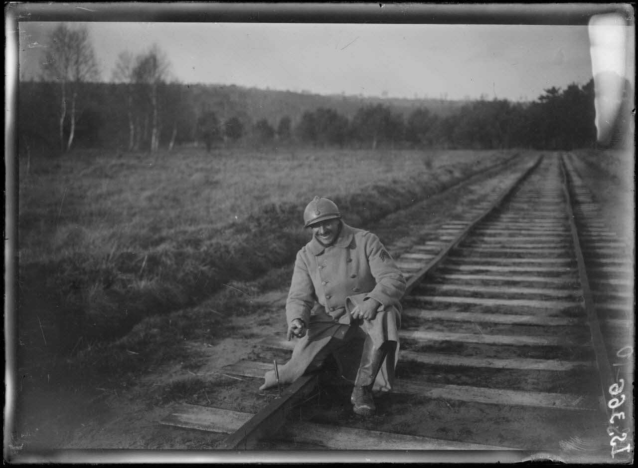 - Près de la gare de Muizon (IS 349 à IS 361) des soldats participent à la pose d'une voie ferrée vers Reims. Les traverses arrivent. Les rails sont déchargés et une locomotive apporte le matériel. Les travailleurs à la soupe.