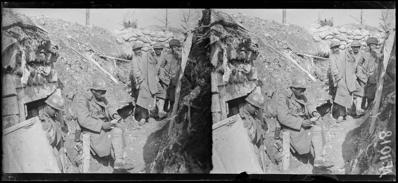 - Dans le secteur de Souain, au PC de l'Etoile, dans le bois de la Chaise, des abris souterrains sont occupés par les soldats. Un guetteur surveille les lignes ennemies.