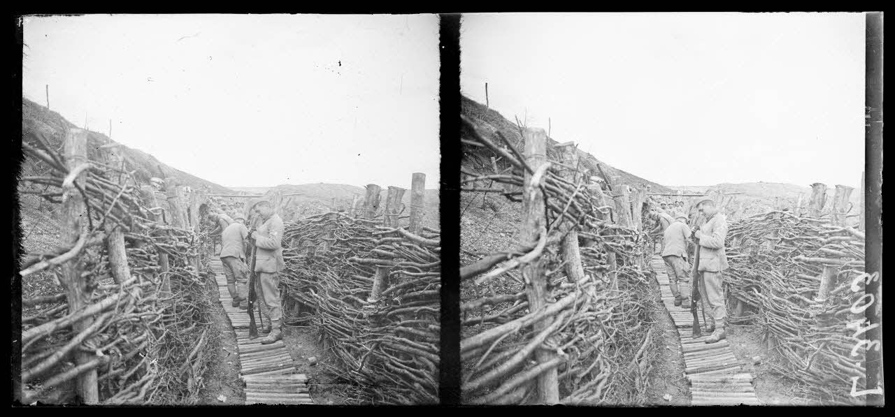 - panorama vers la côte de l'Oie, l'éclatement d'un obus (SPA 70 L 3392), des tombes de soldats de part et d'autre des abris (SPA 70 L 3401), vue sur les boyaux (SPA 70 L 3400), des soldats dans une tranchée, au premier plan un soldat avec un fusil Berthier 1907/1915 modifié 1916, (SPA 70 L 3403) ;