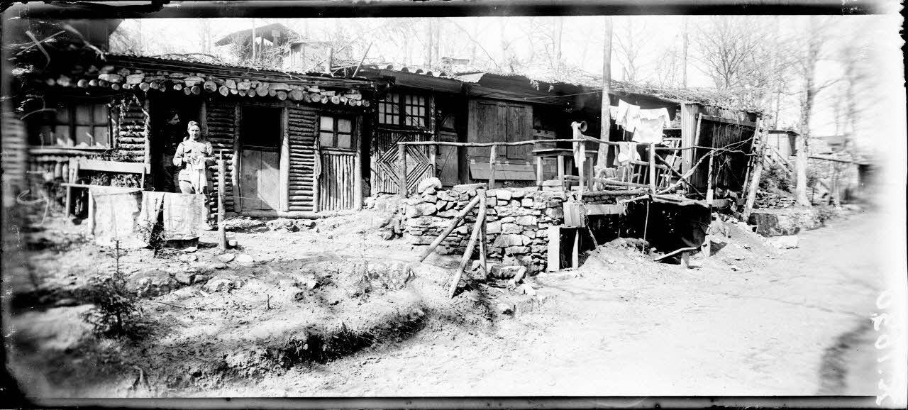 - les baraquements, une voie ferrée étroite Decauville et des territoriaux dans un ravin près de Thiaucourt-Régniéville ;
