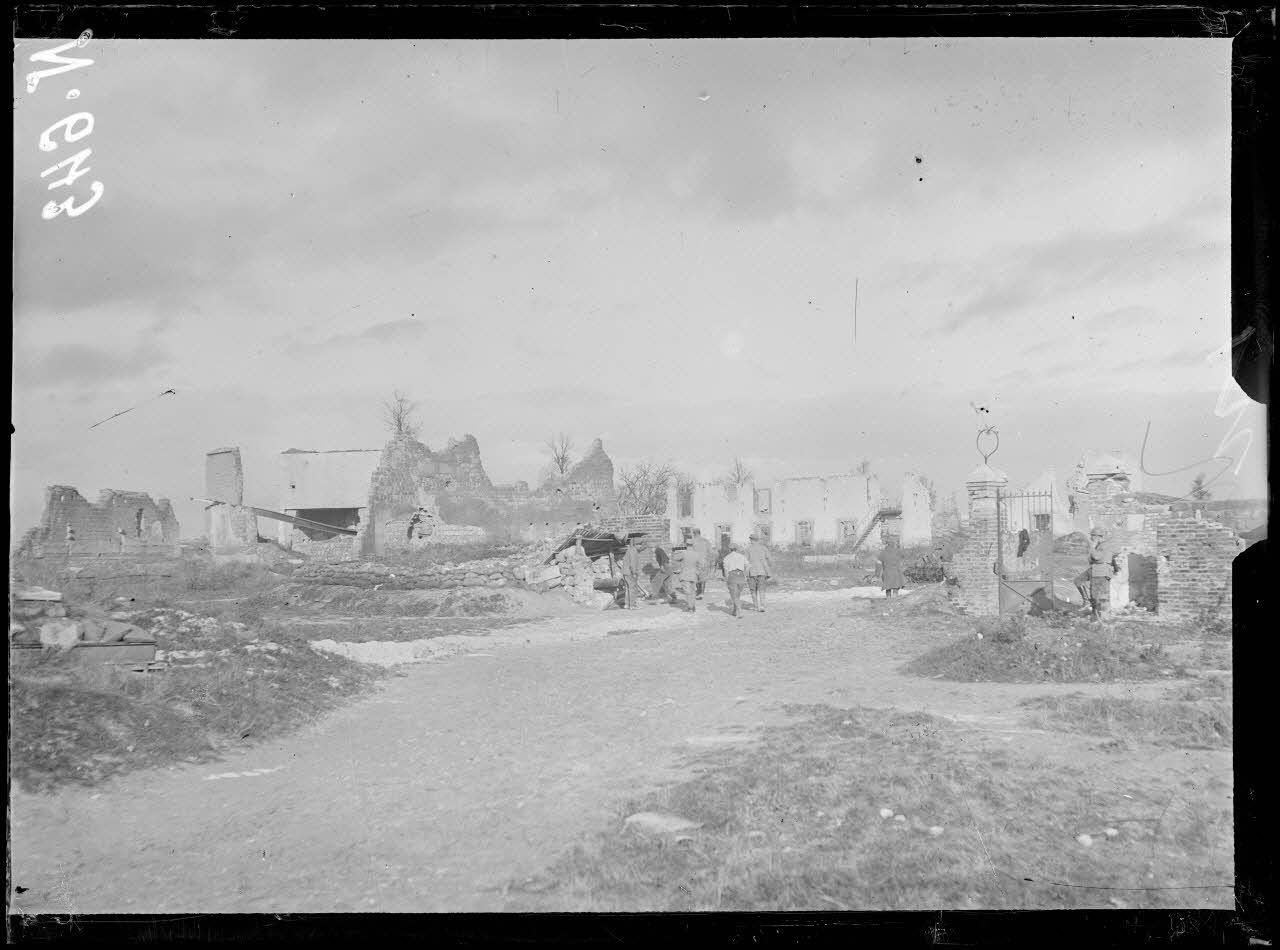 - à Prosnes, des soldats se réchauffant près d'un feu, l’église en ruines, un ravitaillement par Decauville sur une voie de 0,60 m ;