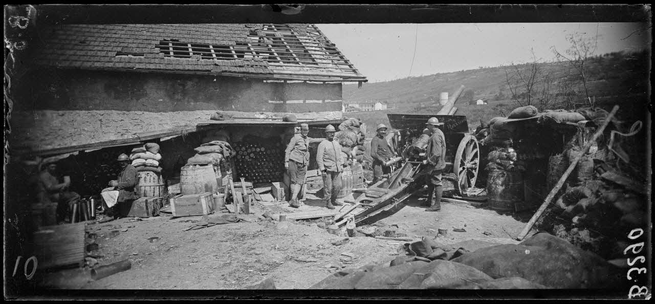 Des hommes du 64e régiment d'infanterie, dont un sapeur de cette unité, sont assemblés autour d'un canon de 75 mm explosé.
