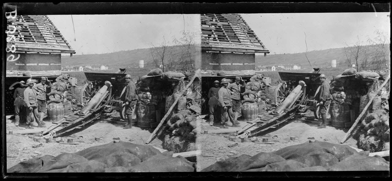 Région de Verdun, près du fort St-Michel. Canon de 105 à tir rapide. Chargement du canon.