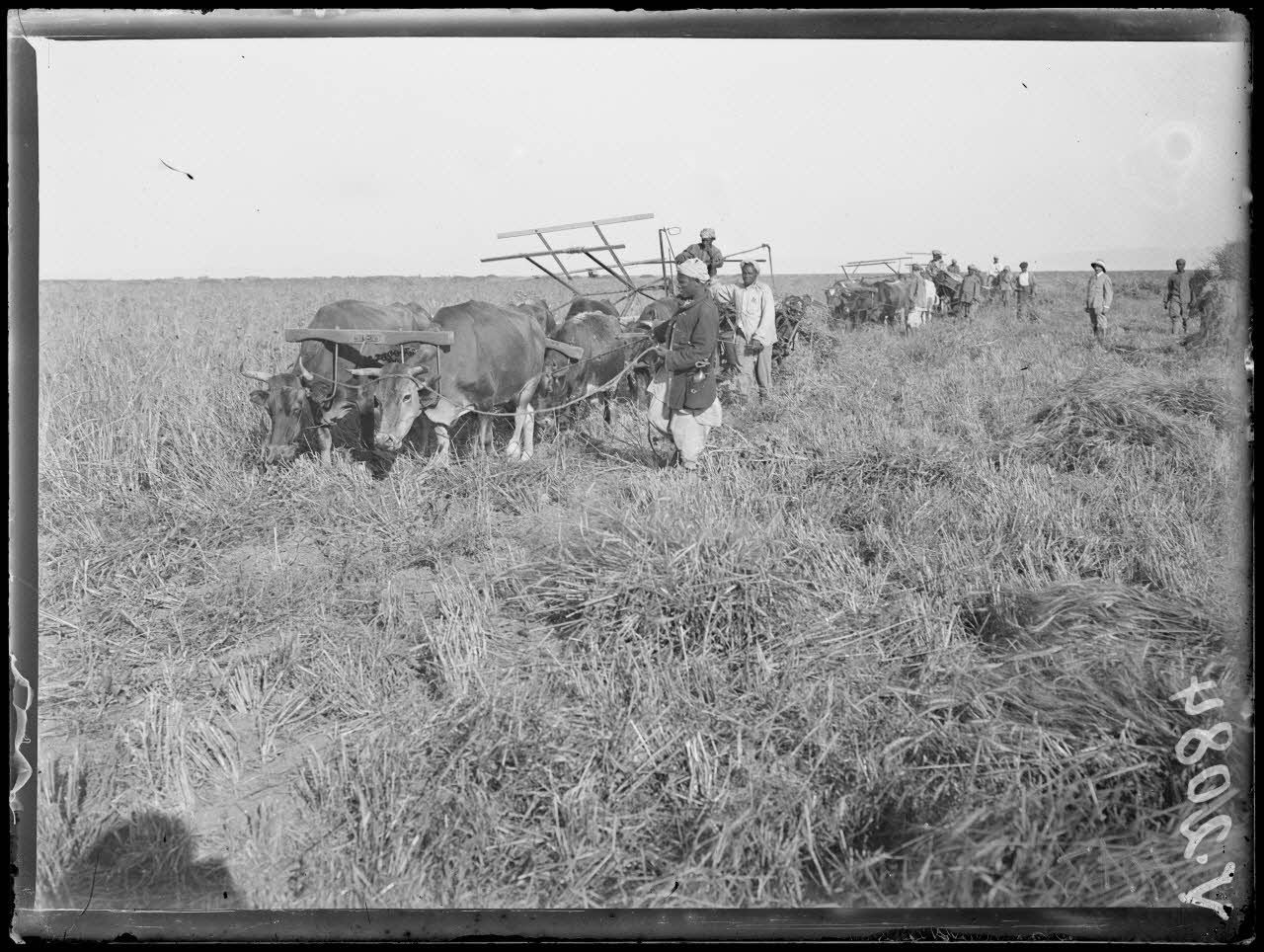 A la ferme de M. Aubert, des machines sont utilisées pour piler le blé et fabriquer du fourrage. Des faucheuses moissonneuses font des meules. Un peu plus loin, un douar s'est établi permettant aux travailleurs indigènes de se reposer.