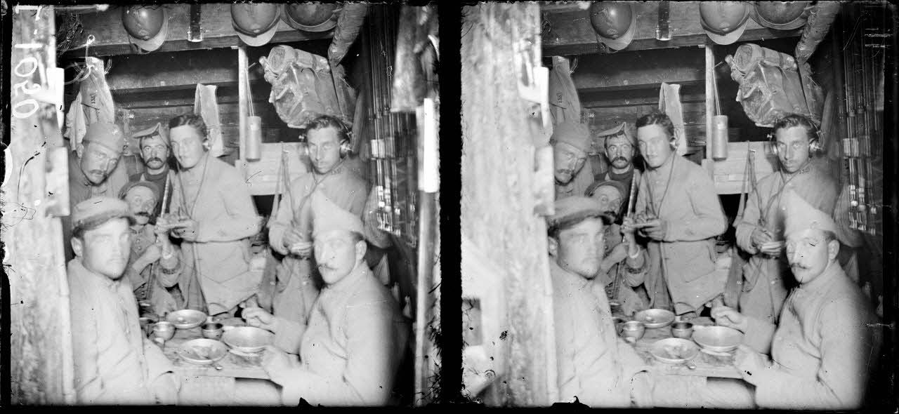 - une troupe de relève gagnant son emplacement en première ligne par les boyaux, une mitrailleuse Saint-Etienne M 1907 (SPA 25 L 1084), des soldats prenant leur déjeuner, un dépôt de matériel pour construire des tranchées (rondins de bois) ;