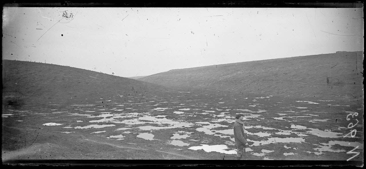 Région du Fort de Vaux. Le marécage devant l'étang de Vaux. En face à droite bois de la Caillette. [légende d'origine]