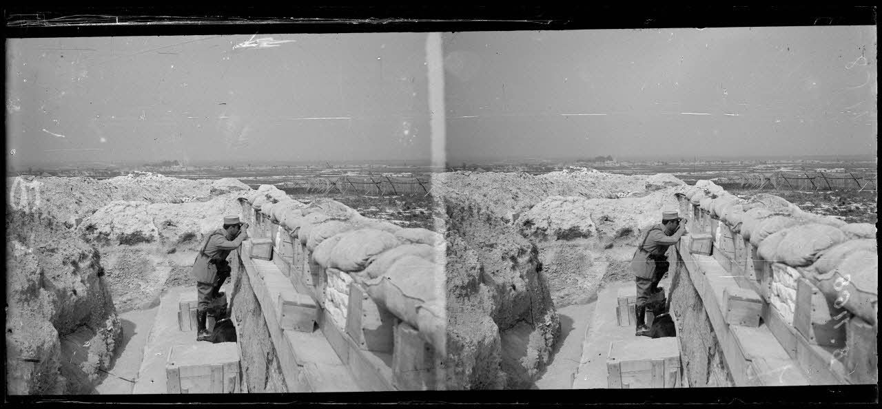 Secteur de la Butte de tir. Poste d’observation région de Cernay les Reims, officier du 147e d’infanterie examinant le terrain.