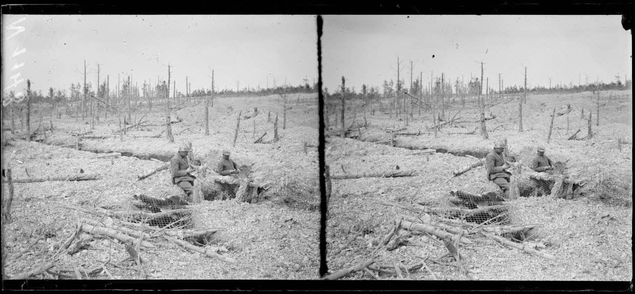 Région du Mont sans nom (Marne). Ancien poste de mitrailleuse allemande, nos zouaves dans les positions conquises (20-4-17).