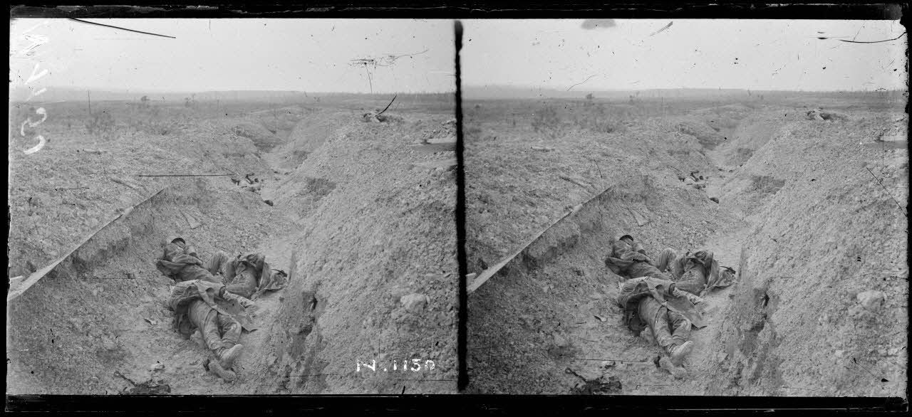 - Près du Mont-sans-Nom, les positions prises par les Français sont immédiatement réaménagées. Dans les anciennes tranchées allemandes bouleversées, des cadavres de soldats allemands demeurent abandonnés. Des ânes assurent le transport des munitions sur un terrain défoncé par les bombardements.
