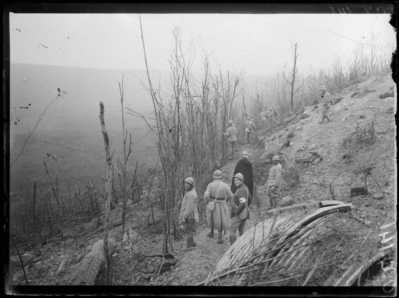 - Les paysages dévastés du moulin de Laffaux. Les tranchées et les pentes de la colline sont entièrement ravagées après des mois incessants de bombardement ;