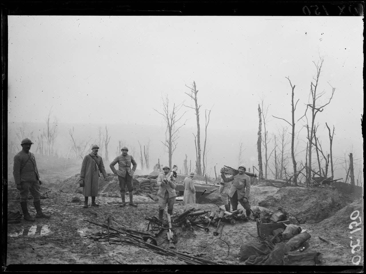 Les hommes du 75e RI (régiment d'infanterie de ligne) rassemblent les mitrailleuses allemandes abandonnées sur le champ de bataille. Des mitrailleuses sMG08 et MG08/15 sont entassées devant le poste de commandement.