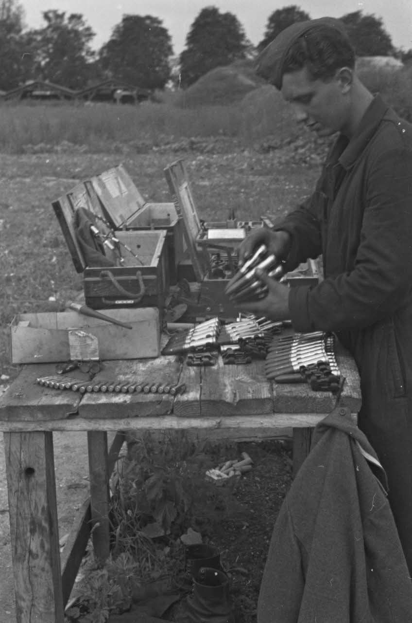 Sur le terrain du Bourget, un cours ou un briefing de l’Oberleutnant Christian Eickhoff et le réglage des armes de bord d'un Focke-Wulf Fw-190 de la Jagd Fliegerschule 5 (JFS5).