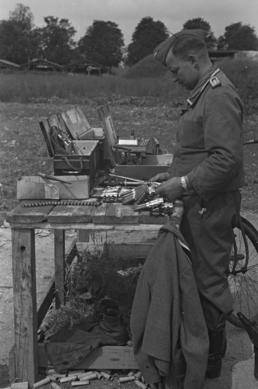 Sur le terrain du Bourget, un cours ou un briefing de l’Oberleutnant Christian Eickhoff et le réglage des armes de bord d'un Focke-Wulf Fw-190 de la Jagd Fliegerschule 5 (JFS5).