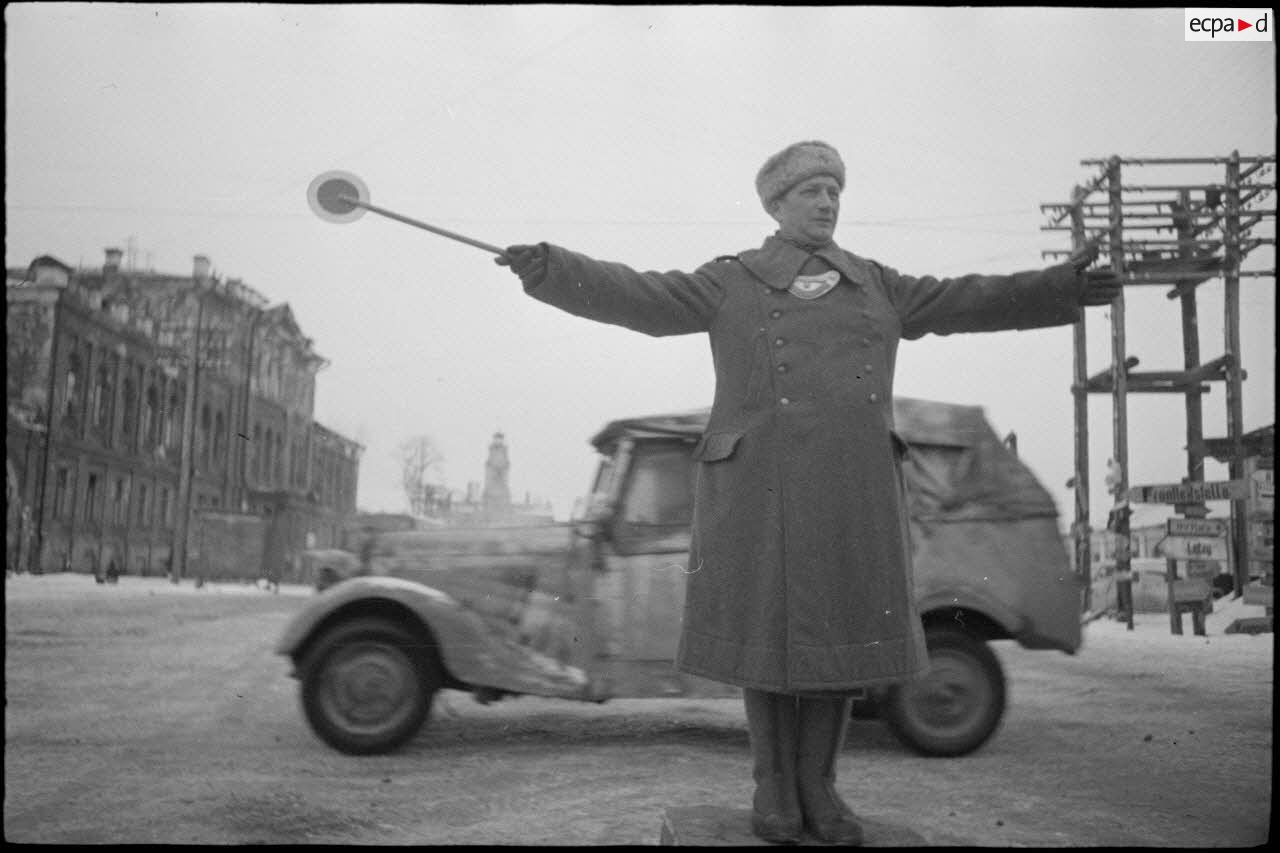 Sur une place de Vitebsk (Witebsk), la circulation est assurée par Feldgendarme, on reconnaît sa plaque hausse-col. Des femmes issues de la minorité allemande, ou qui travaillent pour l'occupant, sourient au photographe qui les immortalise. A la gare de Vitebsk (Witebsk), des permissionnaires de retour de leur foyer vont rejoindre leur garnison. Les soldats déposent leur paquetage sur un traineau pour en faciliter le transport. Les traineaux sont tractés par des enfants qui échangent leur service contre du pain ou des cigarettes.