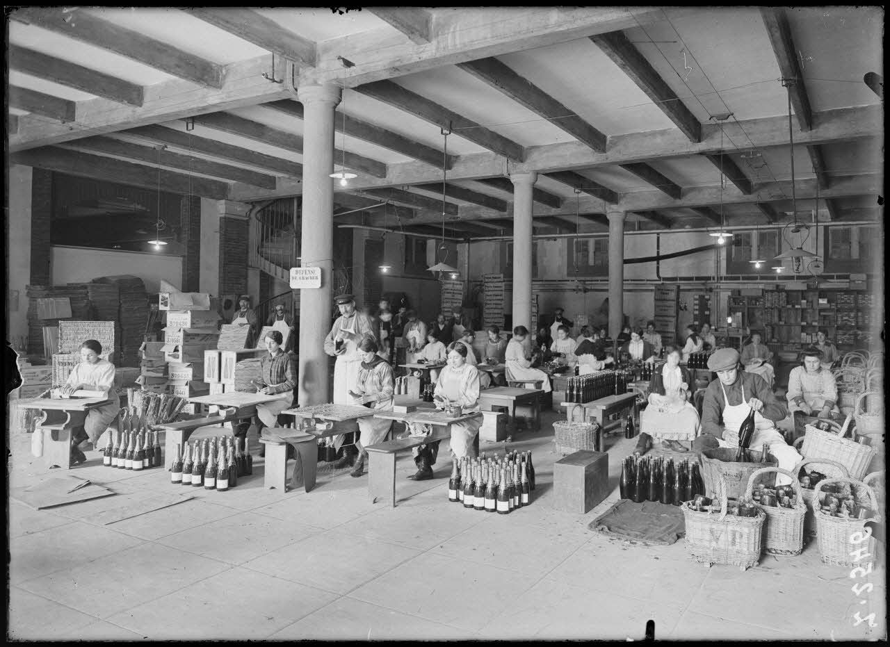 Reims. Caves Pommery. Pose des étiquettes et emballage. [légende d'origine]
