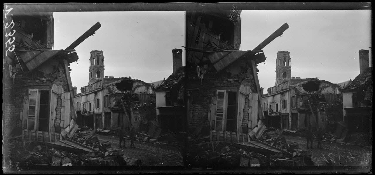 - Près de l'église Saint-André, rue Ruinart de Brimont, une famille déménage ses derniers biens (V 2353) au milieu de la rue dévastée.