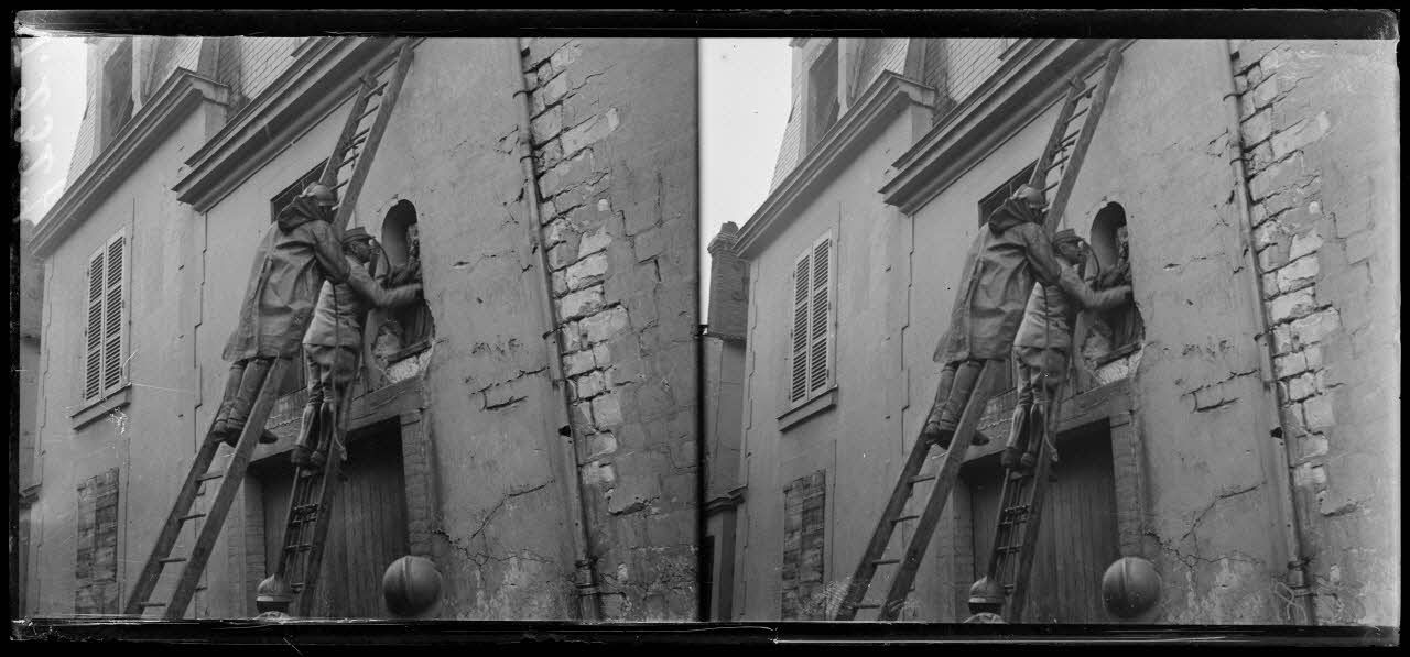 - Rue Libergier (16/01/1918, V 2326 à V 2335) des soldats assurent l'enlèvement d'une statue de la Vierge datant du 14e siècle pour assurer sa protection.