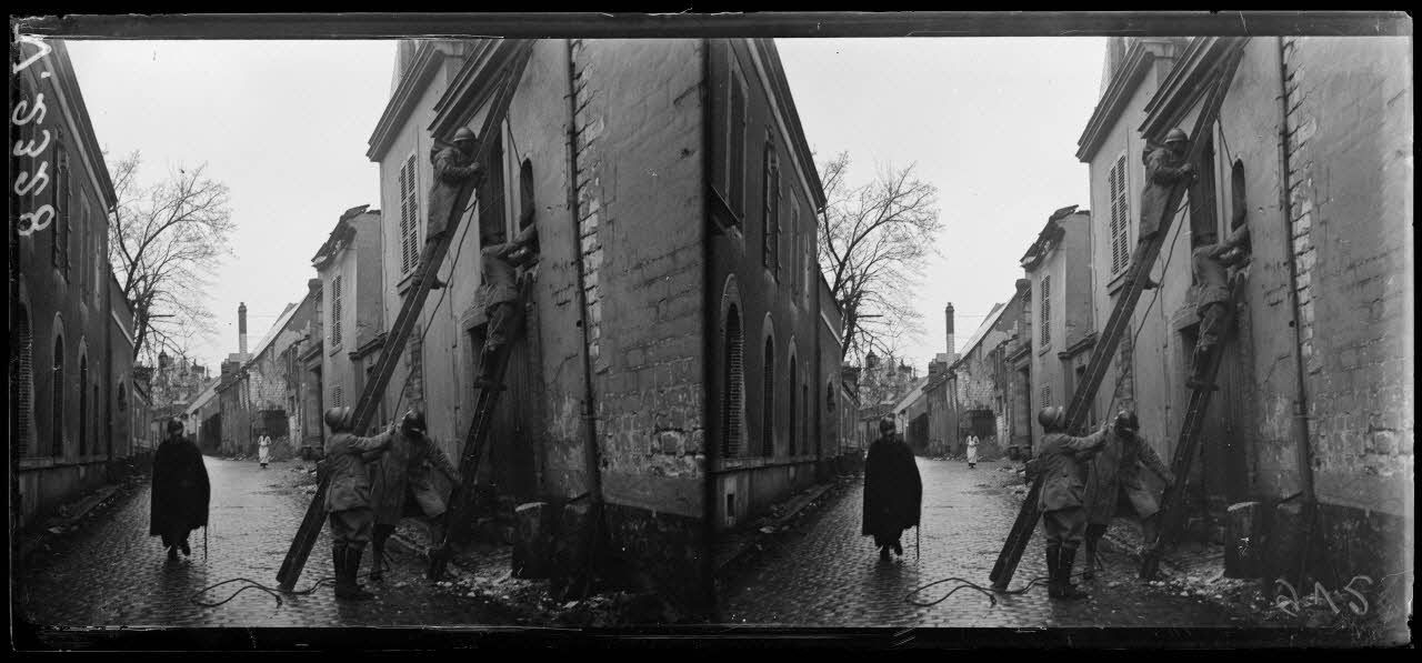 - Rue Libergier (16/01/1918, V 2326 à V 2335) des soldats assurent l'enlèvement d'une statue de la Vierge datant du 14e siècle pour assurer sa protection.