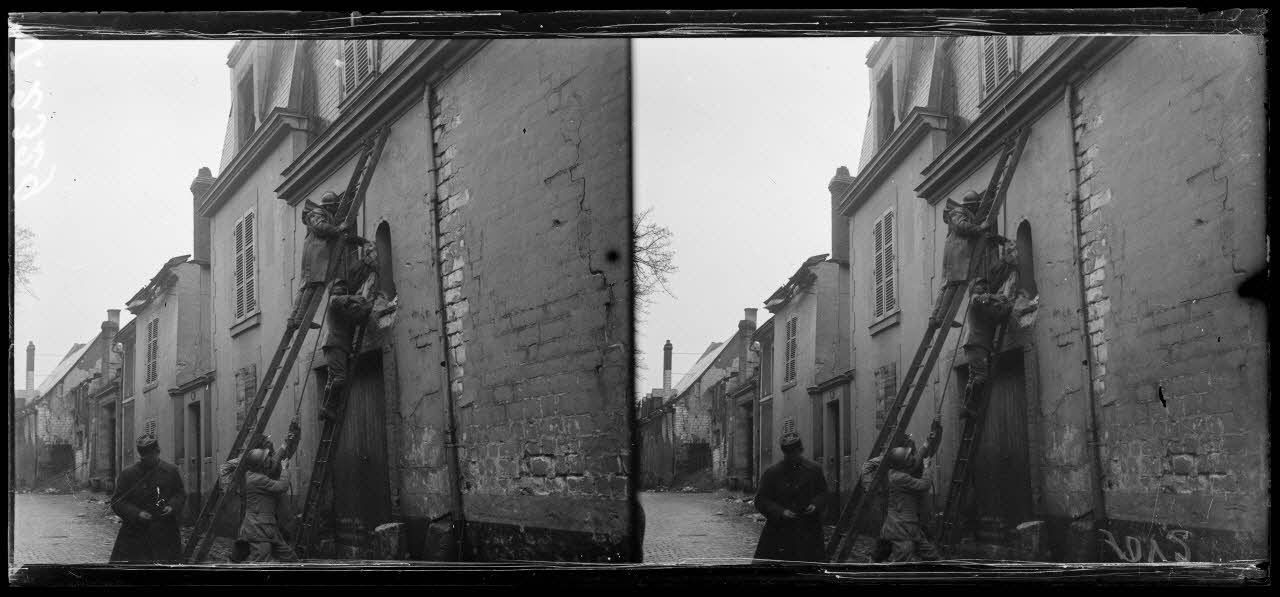 - Rue Libergier (16/01/1918, V 2326 à V 2335) des soldats assurent l'enlèvement d'une statue de la Vierge datant du 14e siècle pour assurer sa protection.
