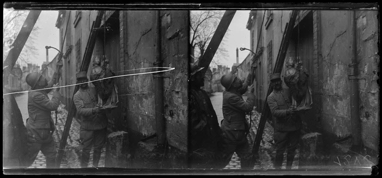 - Rue Libergier (16/01/1918, V 2326 à V 2335) des soldats assurent l'enlèvement d'une statue de la Vierge datant du 14e siècle pour assurer sa protection.