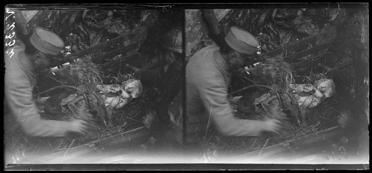 - Rue Libergier (16/01/1918, V 2326 à V 2335) des soldats assurent l'enlèvement d'une statue de la Vierge datant du 14e siècle pour assurer sa protection.