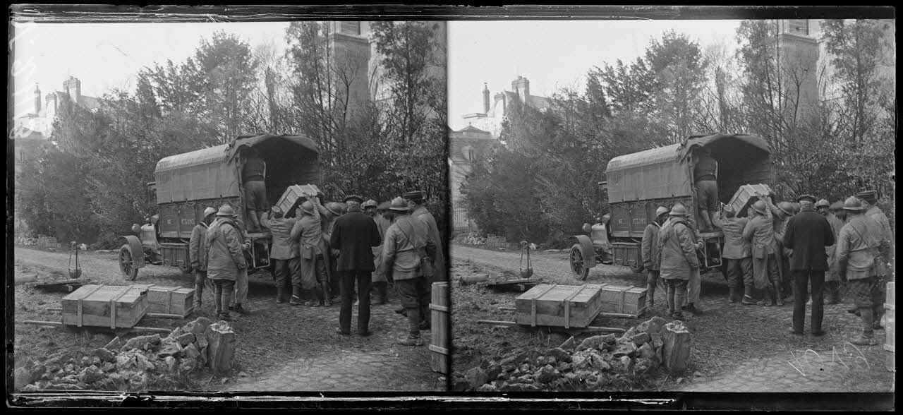 Reims, enlèvement par caisses contenant les vitraux récupérés de la cathédrale. [légende d'origine]