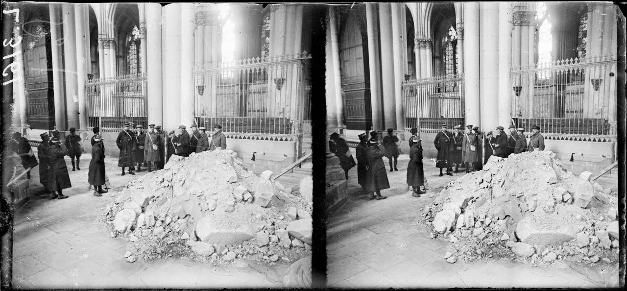 - à Reims, visite d'une mission canadienne ; sur le parvis de la cathédrale, protégée partiellement par des sacs de terre (SPA 64 L 3155/3160/3167), dans la rue (SPA 64 L 3169), à l'intérieur de la cathédrale, les armatures des vitraux brisés lors des bombardements sont posés au sol (SPA 64 L 3156/3159), la mission visite les installations d'un établissement viticole, la maison Clicquot-Ponsardin (SPA 64 L 3170 à 3173) ;