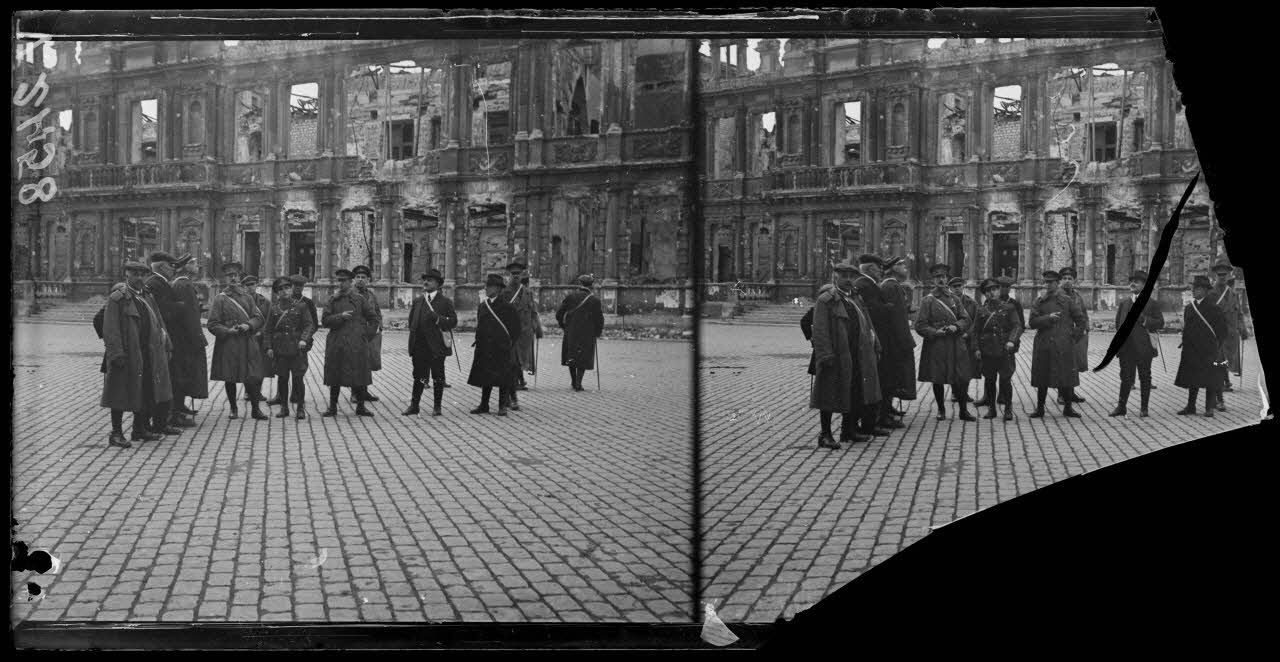 Une délégation canadienne visite la ville de Reims, dévastée par des bombardements et évacuées de ses habitants. La mission canadienne visite le parvis de la cathédrale avant de se rendre chez l'archevêque de Reims, Mgr Luçon.