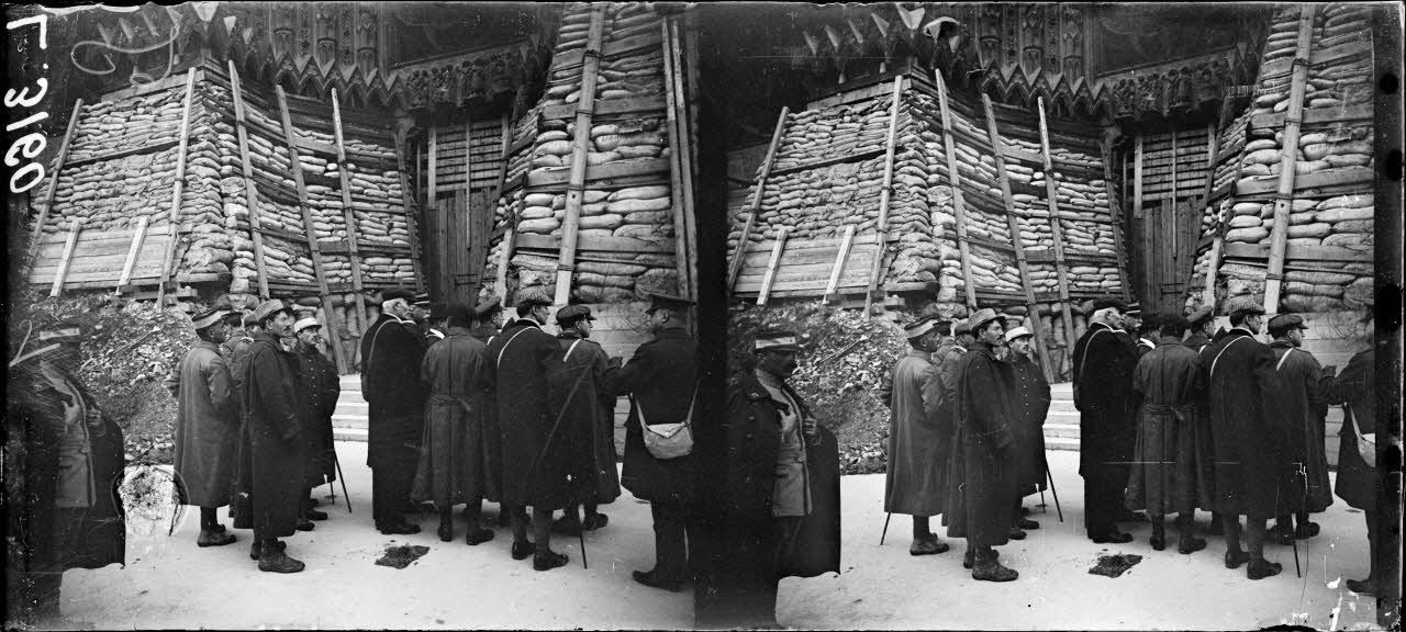 - à Reims, visite d'une mission canadienne ; sur le parvis de la cathédrale, protégée partiellement par des sacs de terre (SPA 64 L 3155/3160/3167), dans la rue (SPA 64 L 3169), à l'intérieur de la cathédrale, les armatures des vitraux brisés lors des bombardements sont posés au sol (SPA 64 L 3156/3159), la mission visite les installations d'un établissement viticole, la maison Clicquot-Ponsardin (SPA 64 L 3170 à 3173) ;