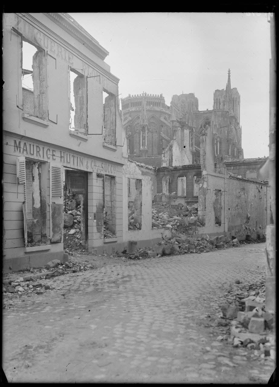 Reims, la rue Eugène Desteuque et la cathédrale. [légende d'origine]