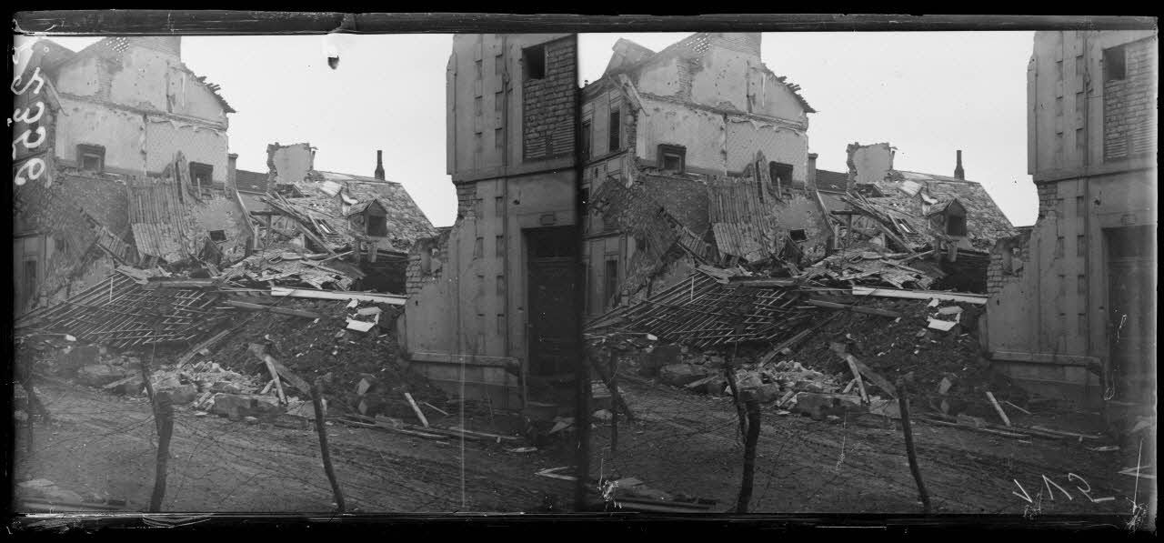 - Près de l'église Saint-André, rue Ruinart de Brimont, une famille déménage ses derniers biens (V 2353) au milieu de la rue dévastée.