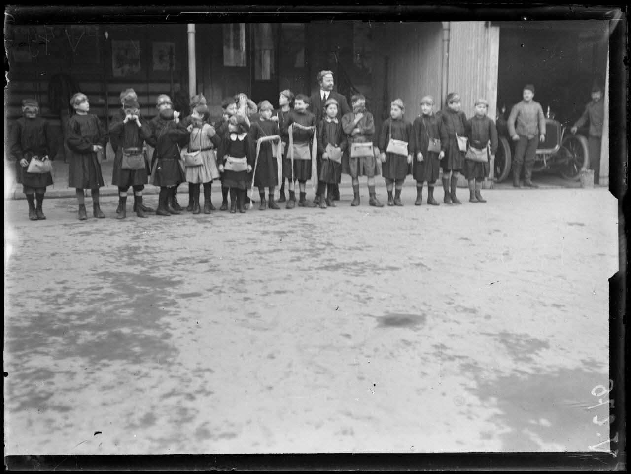 Reims, les enfants à l'école avec les masques contre les gaz asphyxiants. [légende d'origine]