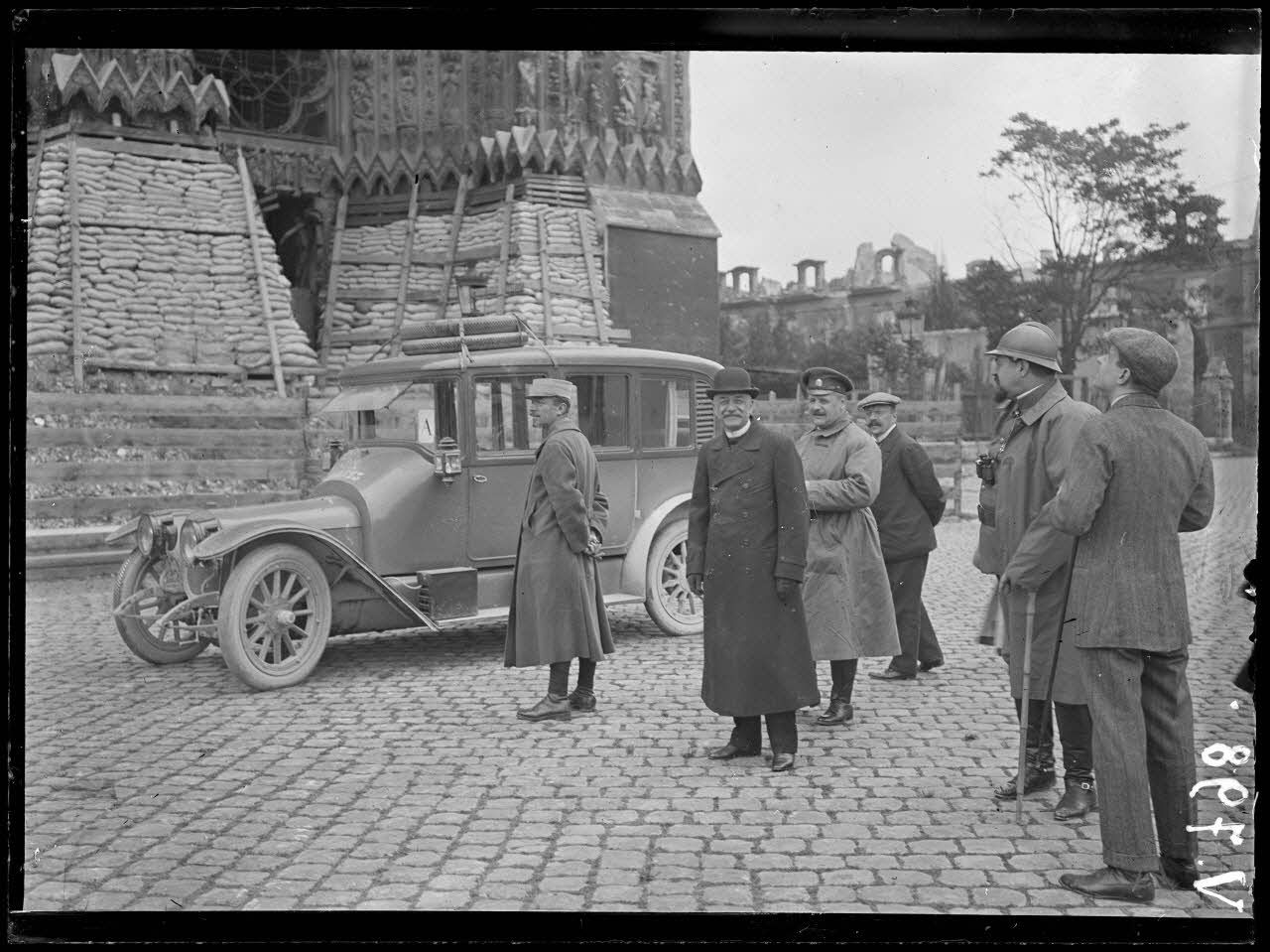 Reims, M. Protopopoff et les membres de la mission russe dans le chantier de travaux de la cathédrale.