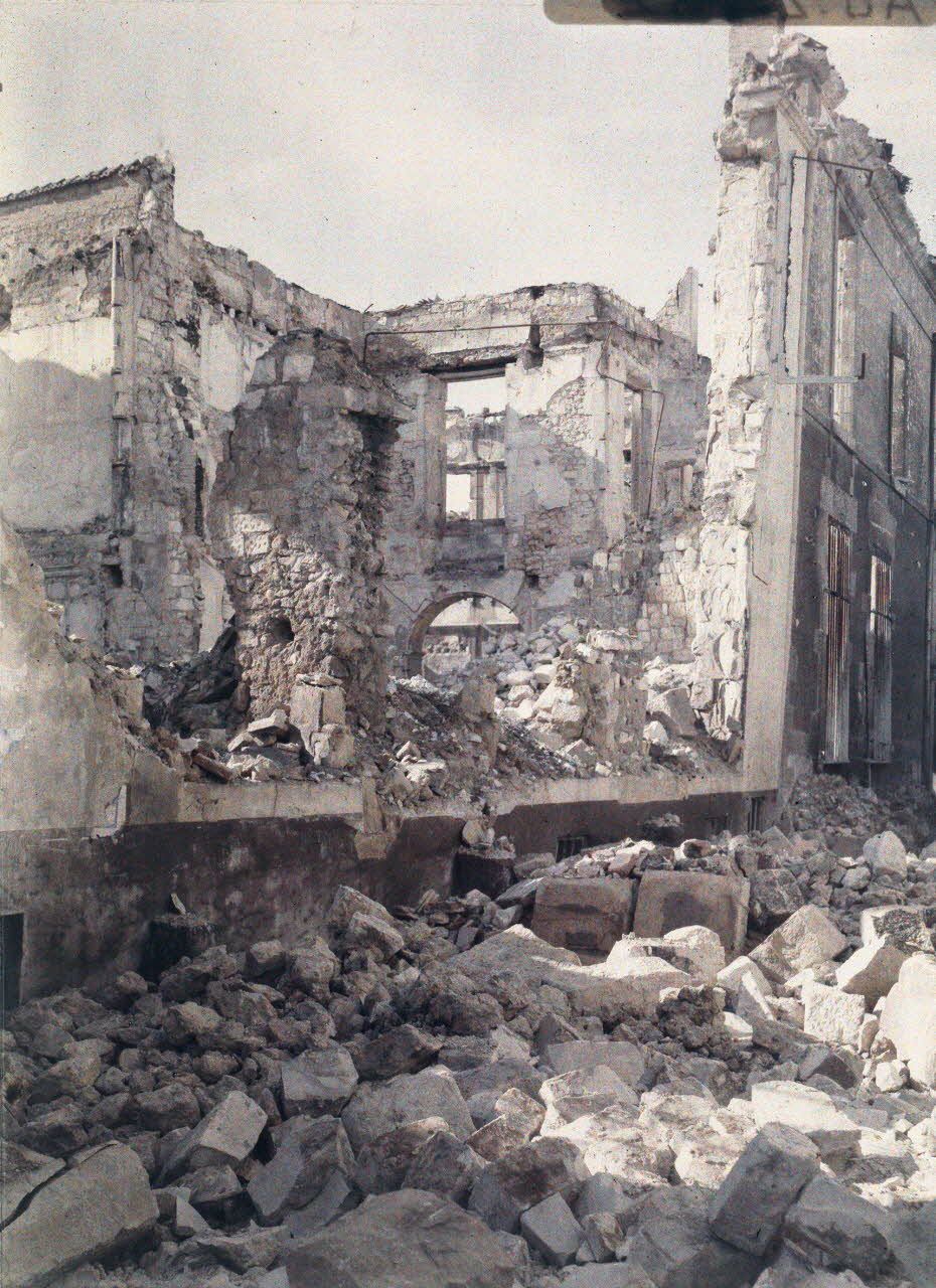 - les ruines et destructions occasionnées par la guerre à Verdun, Reims, Arras ou ailleurs : maisons, églises, cathédrales, lieux symboliques des grandes villes de province en ruines ;