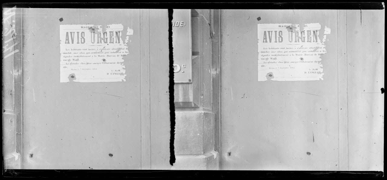 - Dans Reims, l'hôtel de ville est en ruine au lendemain de l'incendie qui dévasta le bâtiment. Au coin d'une rue, une affiche appelle les Français à souscrire au 3e emprunt national. Des réserves d'eau ont été installées par les sapeurs-pompiers.