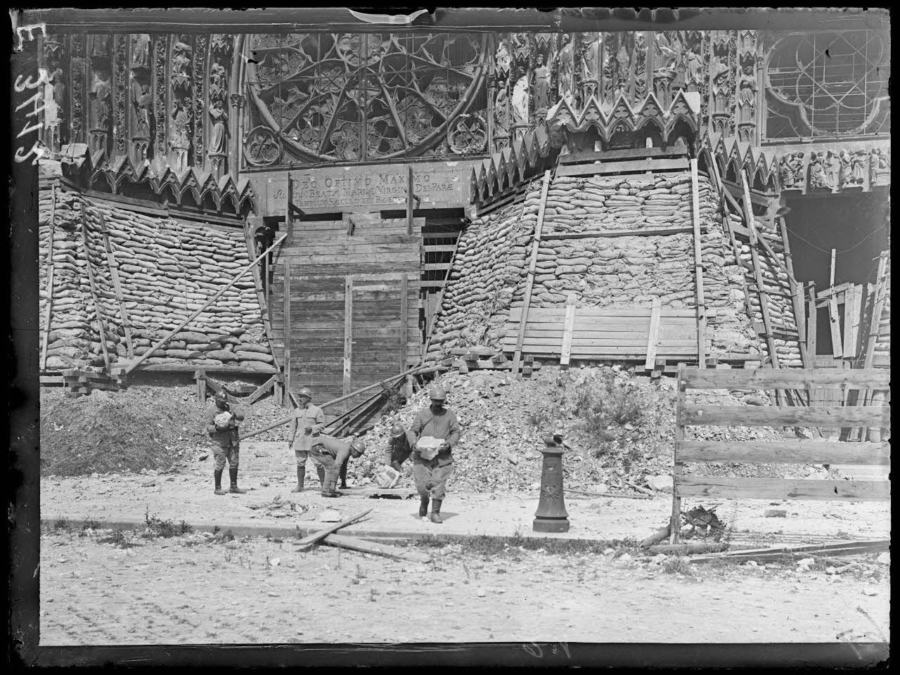 Reims. Marne. Devant la cathédrale. Soldats du service d'évacuation des oeuvres d'art recherchant des fragments de statues. [légende d'origine]