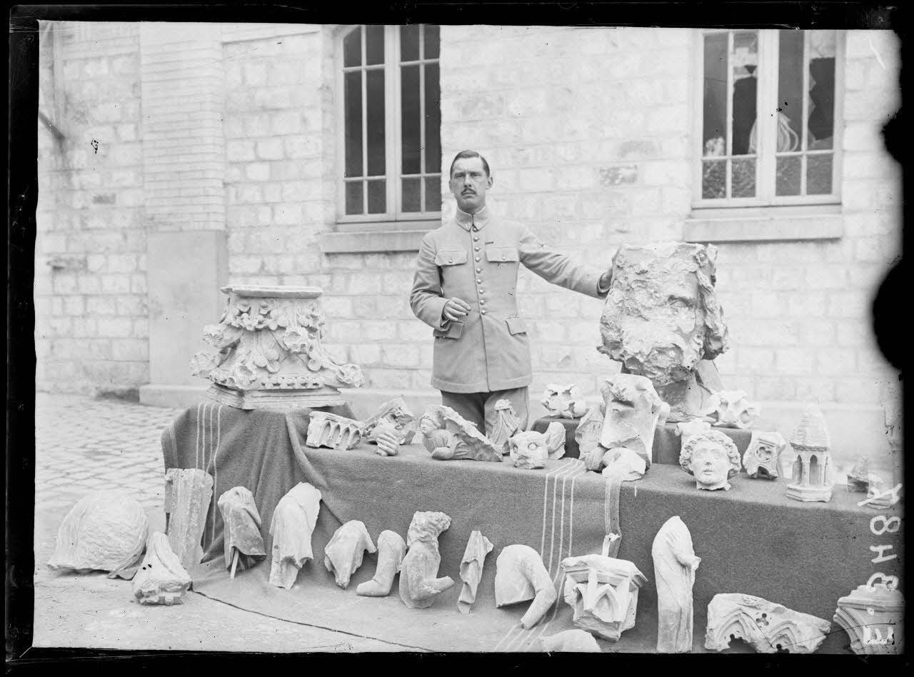 Reims. Marne. Fragments de statues provenant de la cathédrale projetés à terre par les derniers bombardements.