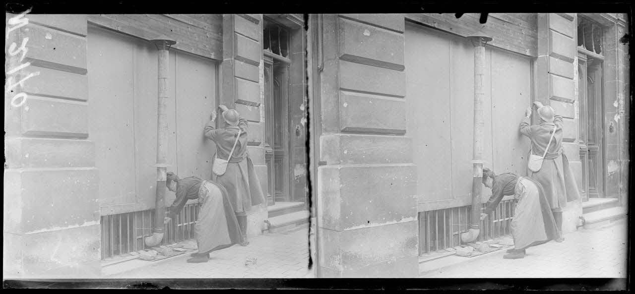 - Dans Reims, l'hôtel de ville est en ruine quelques mois après l'incendie qui dévasta le bâtiment. Au coin d'une rue, une affiche appelle les Français à souscrire au 3e emprunt national. Des réserves d'eau ont été installées par les sapeurs-pompiers.