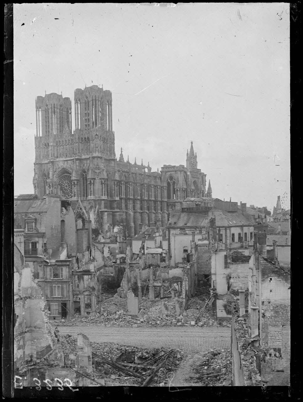Reims. Marne. Place du Parvis. La cathédrale. Maisons en ruines.