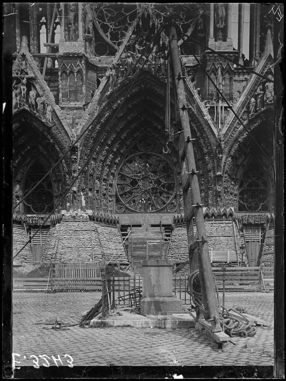 Reims. Marne. La poutre de la cathédrale et le socle de la statue de Jeanne d'Arc. [légende d'origine]
