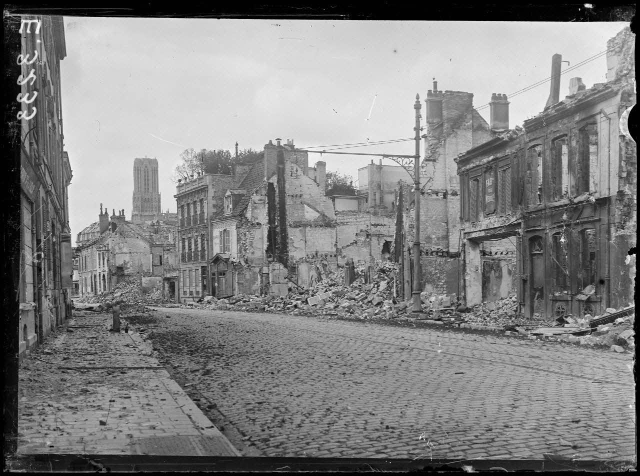 Reims. Marne. La rue Gambetta. Au fond, la cathédrale. [légende d'origine]