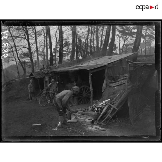 Châlons-le-Vergeur, Marne, cantonnement du 11e Génie, corvée de bois destinée à la cuisine roulante.