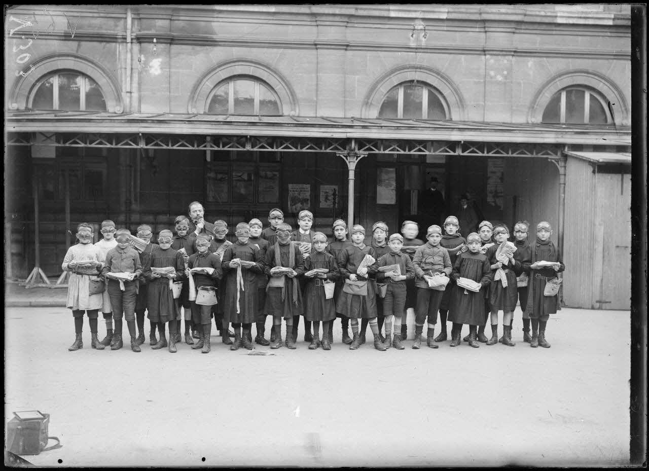 Reims, Marne, les masques contre les gaz asphyxiants à l'école communale. [légende d'origine]