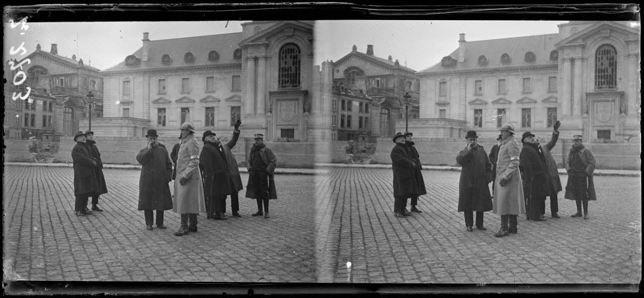 Une mission diplomatique américaine visite la cathédrale de Reims, endommagée par les bombardements. L'ambassadeur des Etats-Unis, William Sharp, est photographié en compagnie de M. Langlet, maire de Reims, de monseigneur Luçon, archevêque, du général Cadoux et du sous-préfet.