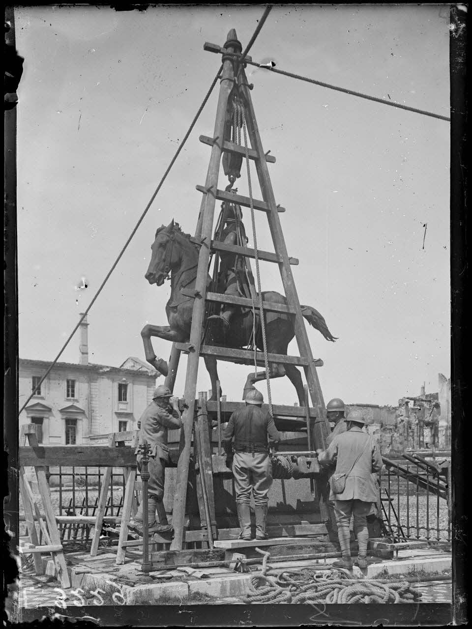 Reims. Marne. Place du Parvis. Enlèvement de la statue de Jeanne d'Arc.