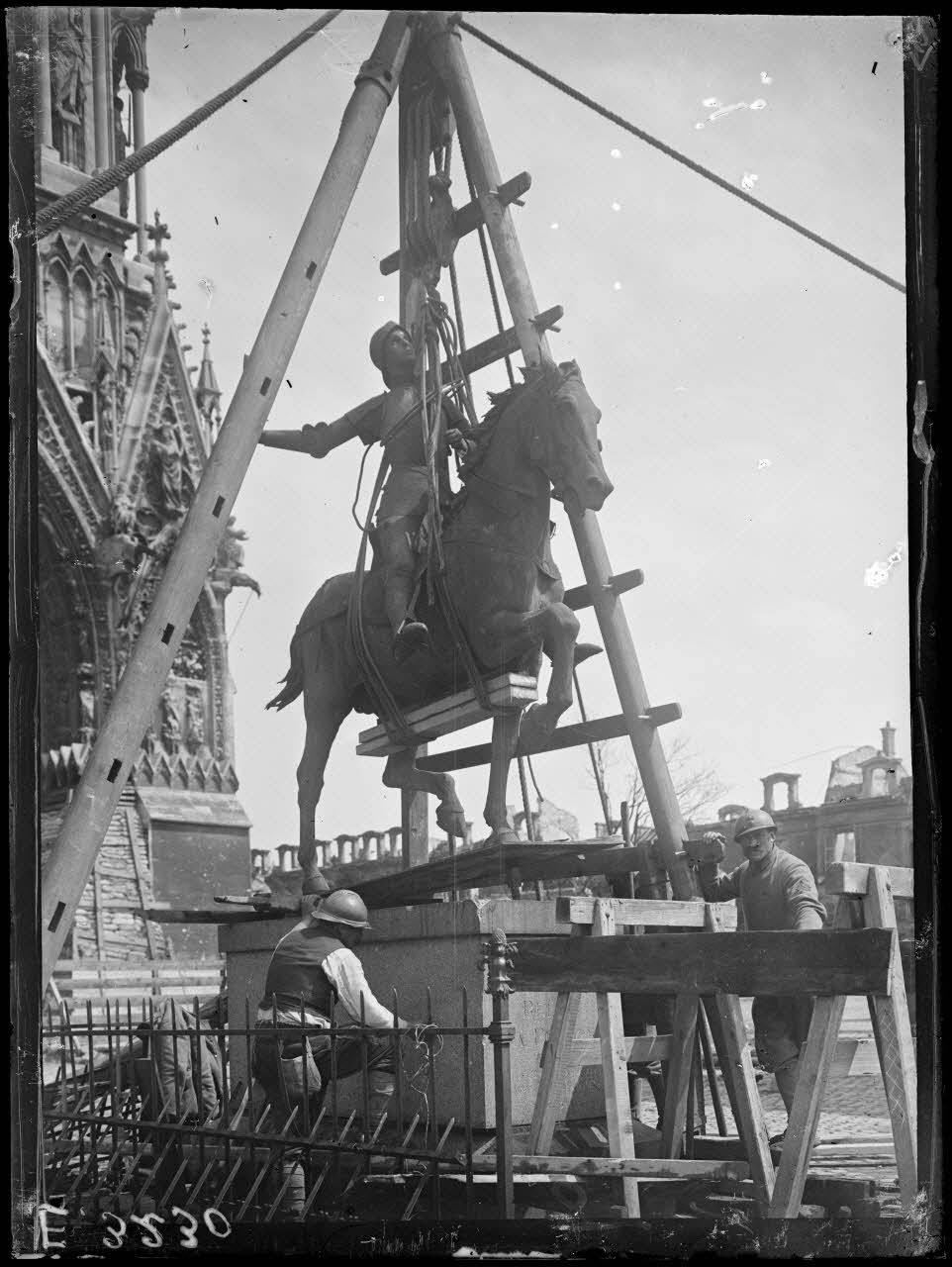 Reims. Marne. Place du Parvis. Enlèvement de la statue de Jeanne d'Arc.