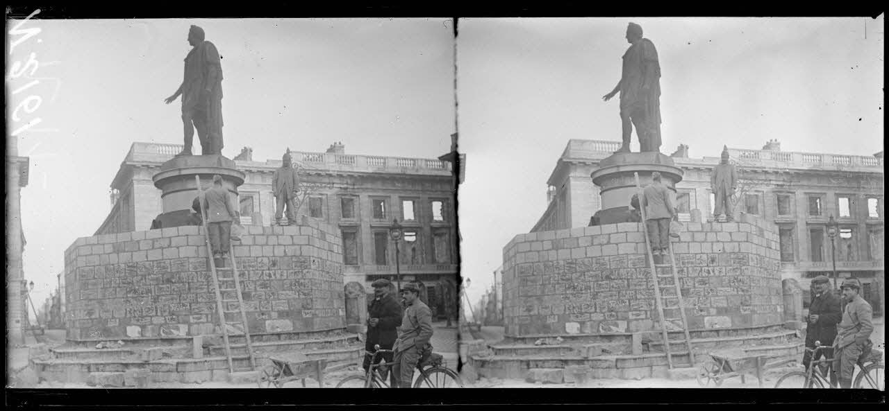 Reims (Marne). Place Royale. Un mur est construit autour de la statue de Louis XV pour la préserver. [légende d'origine]